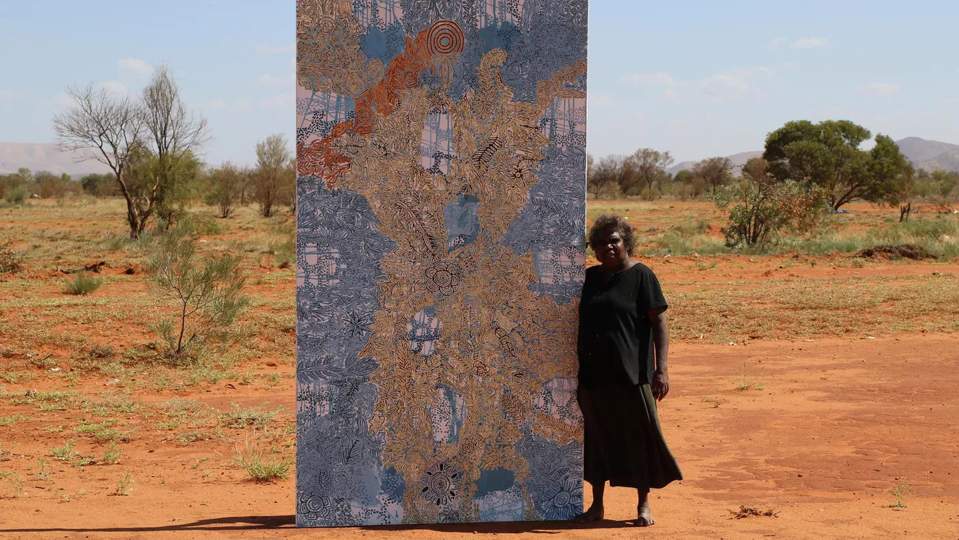 Candy Nelson Nakamarra with her artwork Kalipinypa, image courtesy the artist and © Papunya Tjupi Arts